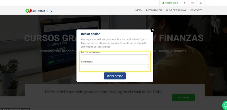 Este espacio es exclusivo para los miembros de BinariasPRO, por favor ingresa con el usuario y contraseña que te fueron asignados al momento de la suscripción.